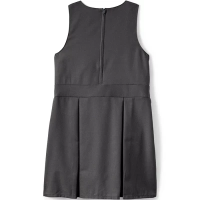 We line the front and back of the bodice with smooth taffeta and stitch in an extra-long back zipper. So this is one jumper that slips on without the usual struggle (comes in handy on gym class days!). Skirt has two sewn-in pleats, plus a pair of decorative buttons on the waistband. Fabric is a polyester/rayon blend that abhors wrinkles almost as much as you do.