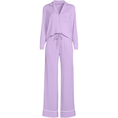 Slip into sleep with our cooling two-piece sleep set. These breathable pajamas will keep you comfortable with moisture-wicking properties, making the fabric feel cooler. The set includes a collared, long sleeve shirt with full button-front closure. And flowy wide-leg pants with a fold-over waistband and an adjustable elastic drawcord for the perfect fit. Plus two handy on-seam pockets, leave you room for all your essentials.